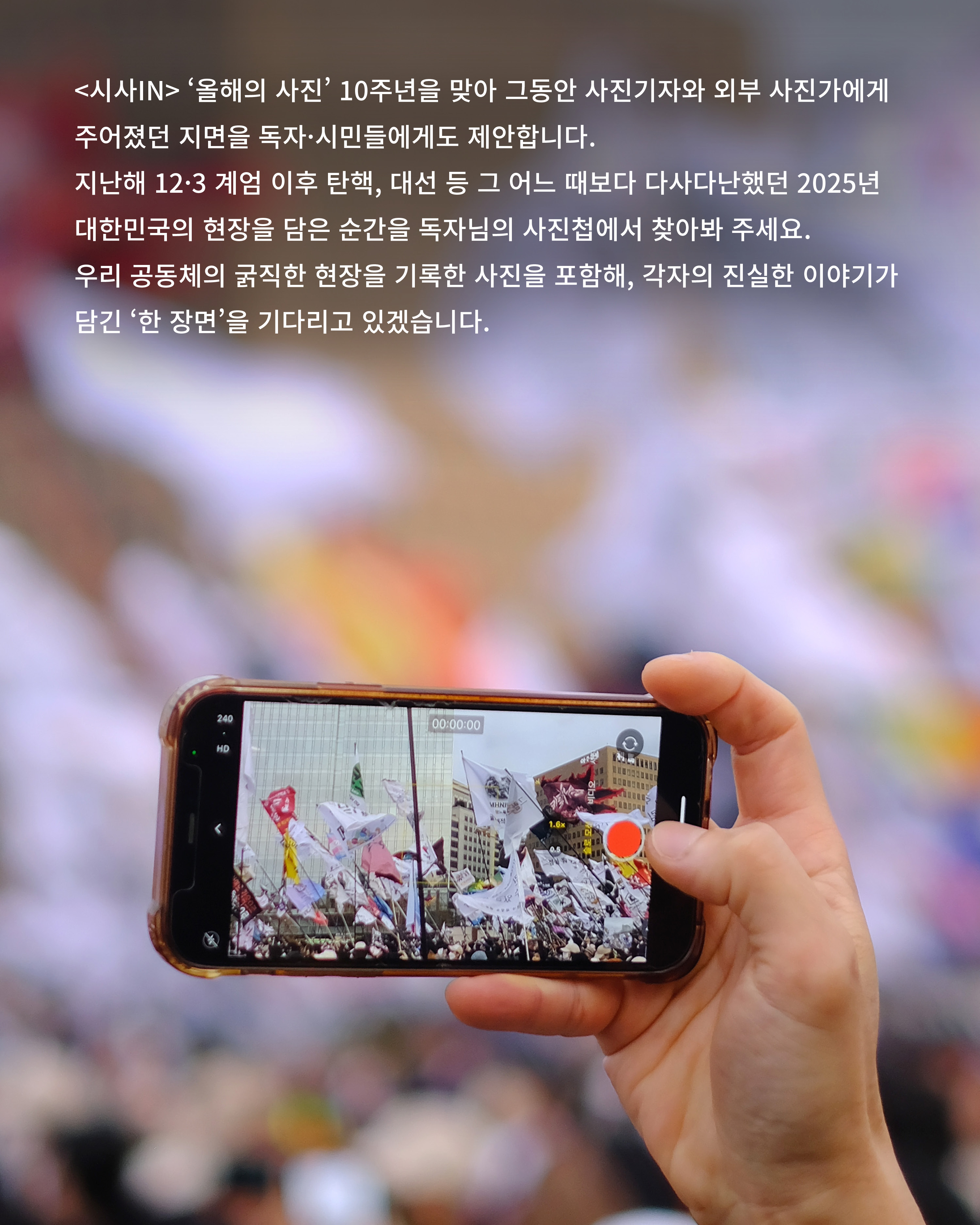 연말에는 사진팀에 중요한 일이 남아 있습니다. 송년호 ‘올해의 사진’이 10주년을 맞아 이번에는 독자·시민과 함께 만드는 기획을 진행 중입니다. 외부 사진가와 <시사IN> 사진기자들의 사진으로 채우던 지면을 독자와 시민에게 열어놓고 있습니다. 접수 기간이 끝나는 10월26일이 다가오면서 제 마음도 슬슬 긴장되기 시작합니다. 뉴스 사진을 시시각각 봐야 하는 저 같은 직업인에게 ‘이건 기자가 절대 못 찍는다’라고 판단되는 사진들이 있습니다. 바로 한 사람의 마음이 고스란히 담긴 사진입니다. 대부분의 사람들은 소중한 순간을 잊고 싶지 않아서 ‘박제’하는 마음으로 카메라를 듭니다. 그런 순간은 보는 이에게도 전해집니다. 독자님의 사진첩에도 분명히 있을 거라 생각합니다. 광화문광장에서, 혹은 자주 걷는 산책로에서 꼭 기억하려고 담아두었던 ‘올해의 장면’을 기다리고 있겠습니다.
