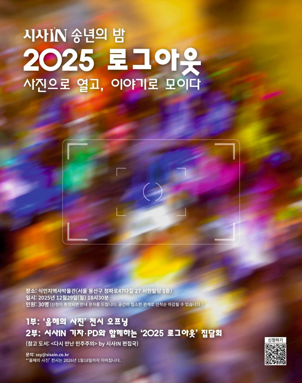 한 가지 소식을 덧붙이자면, 저희는 2025년 12월29일(월) 오후 6시30분 서울 용산구 식민지역사박물관에서 독자분들과 함께하는 조촐한 ‘송년의 밤’ 행사를 준비했습니다. 송년호에 실린 ‘올해의 사진’을 전시하고, 12·3 쿠데타 관련 <시사IN> 기사를 모아서 낸 책 <다시 만난 민주주의> 집필에 참여한 기자와 PD들의 집담회도 엽니다. 편집소통팀 장일호 기자의 사회 아래 정치이슈팀 최한솔 PD와 문화팀 이상원 기자, 사진팀 박미소 기자가 토크를 나눈다고 하네요. 선착순 30명을 모신다고 하니, 연말의 헛헛한 마음을 함께 나누고 싶으시다면 신청 부탁드립니다. 저도 그 자리에서 인사드리겠습니다. 새해 복 많이 받으시기 바랍니다.